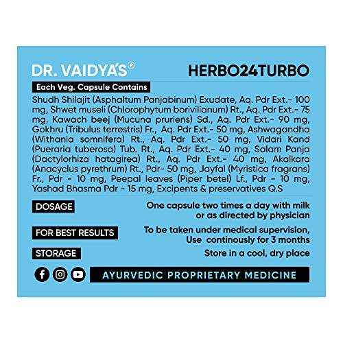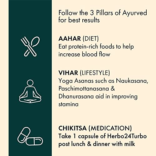 RECOMMENDED DOSAGE: 1 capsule of Herbo 24 Turbo capsule after breakfast and 1 post-dinner with milk(perferred) or water. Continue taking Herbo 24 Turbo for at least 3 months for best results.