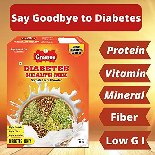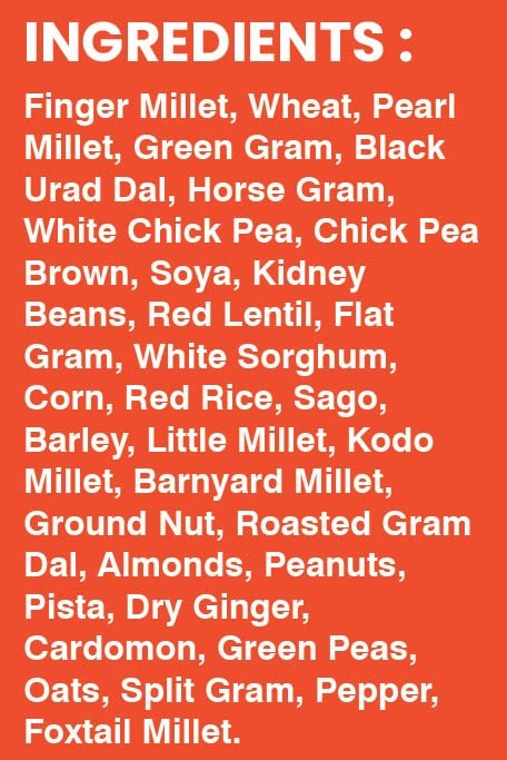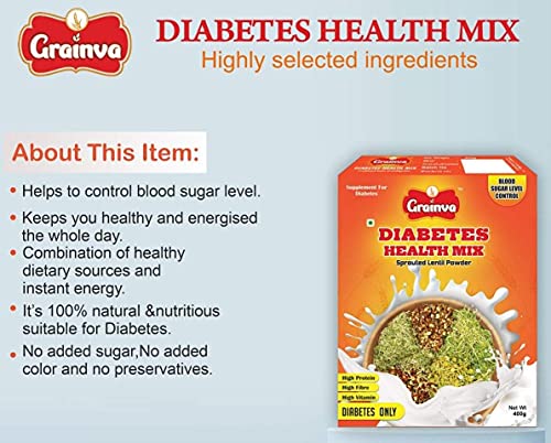 Helps to control blood sugar level slowly in our body. * 100% Natural and Nutritious,Suitable for Diabetes. * Rich source of high proteins,high vitamins and high minerals to keeps you healthy and energy for whole day. * Helps to improve immunity and stamina in your body and healthy weight gain. * Grainva diabetes health mix made from 32 varieties of sprouts,Grains and Millets. Easy to digest,No added sugar,No artificial colour, No preservatives