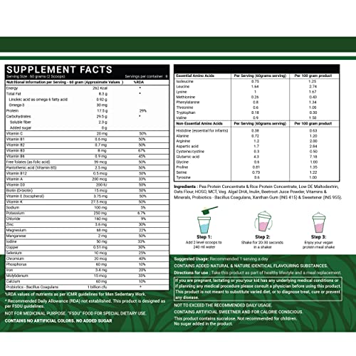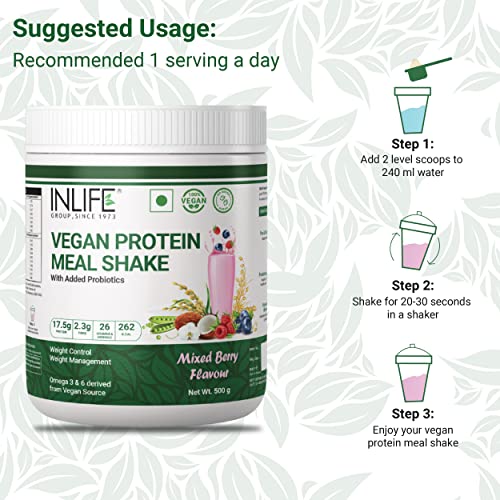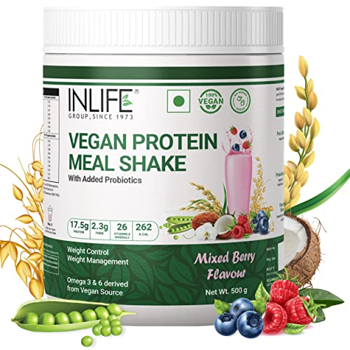 INLIFE Vegan Plant Based Meal Replacement Shake includes 17.5 grams of plant based clean protein (Pea & Rice), 2.3 grams of dietary fiber, 26 vitamins & minerals, 262 calories per serving. Medium Chain Triglycerides MCT supports lean muscle, provides healthy fat and boost energy. Our amino acid infused plant based protein blend promotes complete healthy balance. INLIFE Vegan Meal Replacement Shake is a complete vegan and vegetarian friendly, meal on the go for those with little or no time for breakfast, lunch, or dinner. A perfect way to supplement your daily diet and nutrition needs. This product includes berries that are a rich source of Antioxidants, Oats as rich source of fiber and comes with added probiotics to support your gut health. A perfect blend of Pea Protein Concentrate, Rice Protein Concentrate and Oats powder having an exceptionally good PDCAA score. It provides Protein, Carbohydrates & Fat in a balanced ratio of 2:3:1.