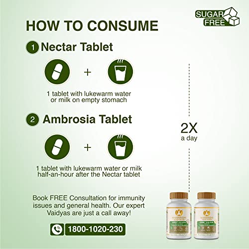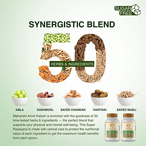 COMPLETE HEALTH TONIC 100% CLINICALLY VALIDATED: Amrit Kalash is a clinically tested formulation with over 75 research done globally that proves its efficacy. MADE BY FOLLOWING AUTHENTIC & TRADITIONAL PROCESS: Maharishi Ayurveda Amrit Kalash is prepared by following 250 meticulous steps as mentioned in the ancient texts of Ayurveda. 22 kgs of raw ingredients are used to produce a single jar of Amrit Kalash Nectar. The herbs are processed under controlled conditions to preserve their nutritional value. Stringent manufacturing practices are followed to make sure you get an authentic product of unparalleled quality. HOW TO CONSUME: Maharishi Ayurveda Amrit Kalash is the best ayurvedic immunity booster and health supplement that can be consumed in all seasons. Take 10 gms (1 tablespoon) of Nectar paste with lukewarm milk or water. Wait for half an hour and take 1 tablet of Amrit Kalash Ambrosia. Follow this in the morning as well as evening. For sustained results, it is recommended to consume Amrit Kalash for 4 to 6 months.