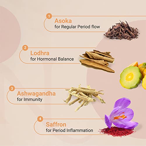 BENEFITS –. Regular Period flow. Muscle cramps and period inflammation. Harmonal balance, Acne Control, Immunity, Deto. It has the right ingredients to nourish the harmones and create an effective functioning of them. Asoka for Regular Period flow. Shatavari for increasing Estrogen naturally. Ashwagandha for immunity. Lodhra for Harmonal Balance. Saffron for muscle cramps and period inflammation
