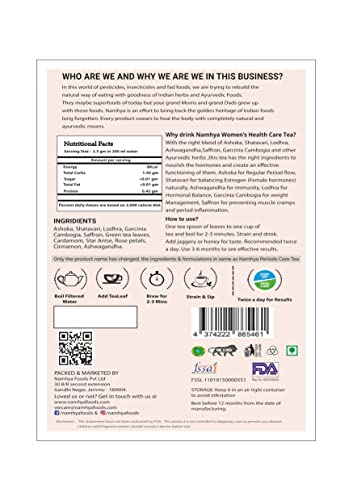 PRODUCT – USFDA registered Namhya PCOS PCOD Women’s Health Tea with the right blend of Ashoka, Shatavari, Lodhra, Ashwagandha, Saffron, Garcinia Cambogia, Green Tea leaves, Cardamom, Star anise, Rose petals, Cinnamon and other Ayurvedic Herbs 100% Natural: Contains all natural ingredients,chemical-free