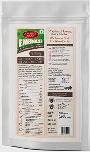 Energizer Health drink mix is a power-packed wholesome drink that provides sustainable (continued) energy. It is prepared using more than 30 whole grains, Nutri-cereals (millets), selected sprouts, pulses, hygienically processed to ensure better retention of all the nutrients along with great taste, few to enlist Finger millet, Bajra, Maize, Barley, Green gram, Horse gram, Peas, Bengal gram, Groundnuts, Nutri-millets. All these contain a significant amount of protein, essential amino acids, slowly digestible starch, steadily releasing energy and a considerable amount of dietary fibre along with protective vitamins (Thiamine, Riboflavin, Niacin, Pantothenic acid, folate, b-Carotene, vitamin—C) and essential minerals ( Calcium, Magnesium Phosphorus, Iron, Zinc, Selenium, Copper etc.)
