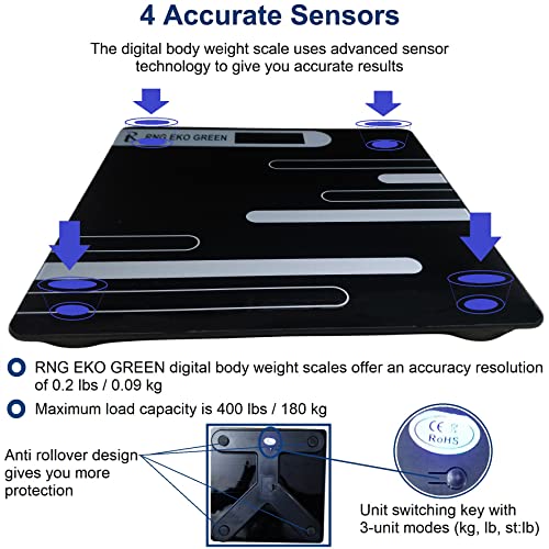 ✅SMART STEP-ON TECHNOLOGY – Instant accurate readout as soon as you step on the scale. Non-slip feet will not scratch floors, up to 400lbs/180kg, 3-unit modes (kg, lb, st:lb)