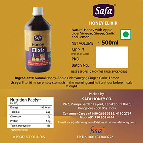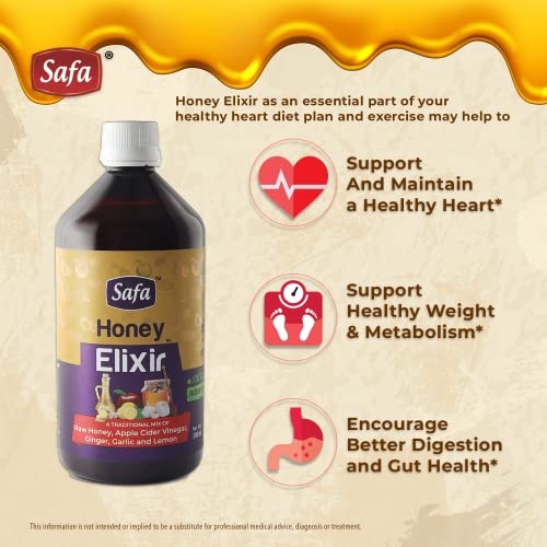 A sensational blend of the age-old traditional remedy of Raw Honey, Apple Cider Vinegar, Ginger, Garlic and Lemon, Safa Honey Elixir is a rage in the natural wellness community. Safa Honey Elixir is just the right companion for a healthy, balanced life. Benefits Of Honey Elixir: A well-curated formula of Raw Honey, ACV, Ginger, Garlic and Lemon in a fine homogenous blend, with the following health benefits: Supports Heart Health: Our Honey Elixir is a synergistic combination of natural remedies that bust the causes of heart disease at its roots. This blend works efficiently to reduce bad cholesterol, prevent deposit of plaques in arteries and hardening of artery walls, thereby preventing blocks in circulation. It maintains cardiac tonicity and normal blood pressure. Helps Weight-Loss: A powerful combination of metabolism-boosting, detoxifying, antioxidant and anti-inflammatory ingredients, our Honey Elixir is an assured and healthy aid for weight loss, as an essential part of your calorie-controlled diet and exercise. Digestive system support: Each natural ingredient in this Honey Elixir trusted for its beneficial effects on the digestive tract team up and become a one-stop solution for your digestive discomforts like hyperacidity, heartburns, flatulence and constipation. Immunity Booster: With the potent antioxidant, anti-inflammatory and immunostimulant properties, this Honey Elixir is a must-have in your armour of immune support health supplements. Cleanse and Detoxify: Vital body functions are optimal only when toxins are eliminated from your body. This Honey Elixir is an ideal concoction to detoxify and cleanse your liver and purify the blood, so that the nutrients and remedies you consume are assimilated completely. Savour our premium Honey Elixir by the spoonful twice daily, ideally on an empty stomach in the morning and 30 minutes before dinner everyday, or whenever you need relief from discomforting symptoms and fatigue